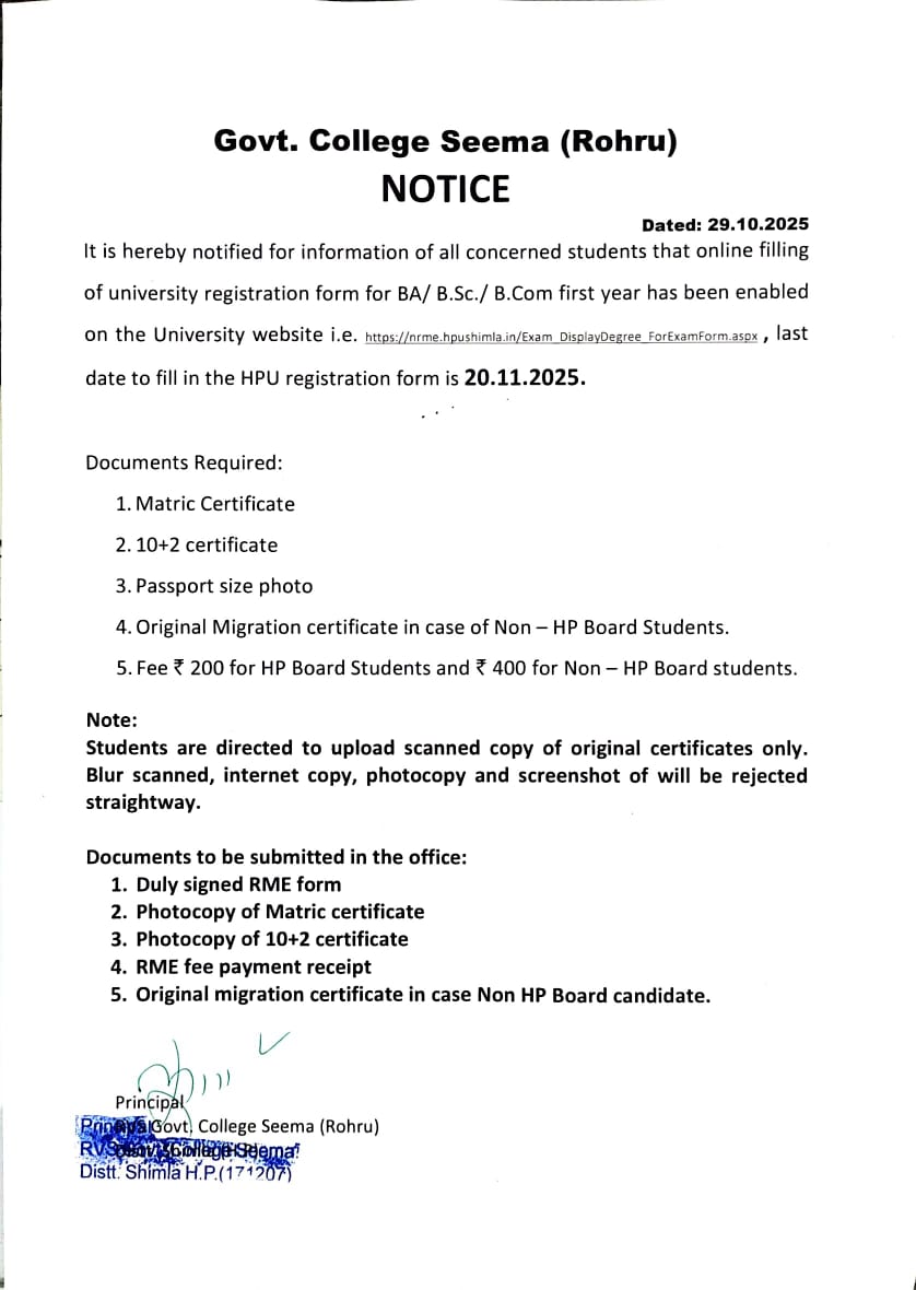 HP University Registration form of BA/B.COM/B.SC Ist year